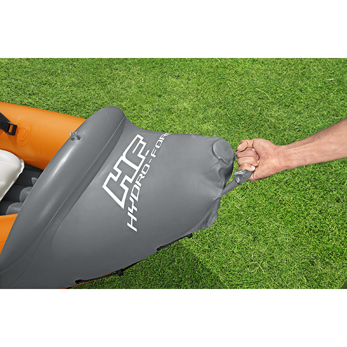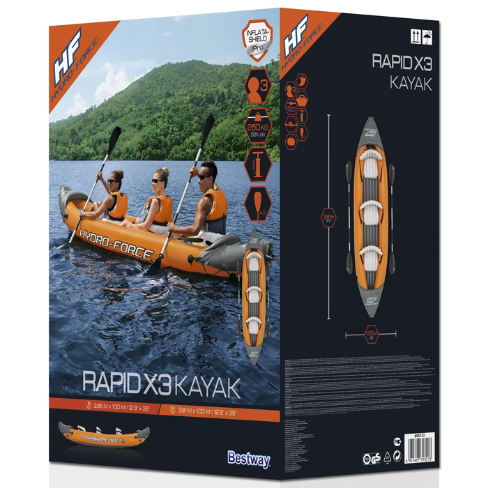 The Hydro-Force™ Rapid X3 Inflatable Kayak Set is a must-have for every outdoor enthusiast. Not only will this roomy kayak hold up to three adults, but it also inflates and deflates quickly and packs down to a small size, making it easy to bring along on any adventure. Made from Inflata-Shield Pro™ material, this kayak offers excellent puncture resistance and rigidity, limits stretching and maximizes stability. The Rapid X3 is great for use on creeks, small rivers, lakes and more. The comfortable cockpit features three inflatable seats with cushioned backrests to keep you comfortable on long rides, while the form-fitted construction prevents water from getting into the kayak and soaking you or your gear. A grab rope with built-in grommets allows you to easily transport or dock the kayak. Or use the sturdy carrying handles to transport the boat while inflated. The set also includes a pair of aluminium paddles and a convenient hand pump for easy inflation. Bring out your inner explorer with the Hydro-Force Rapid X3 Inflatable Kayak.