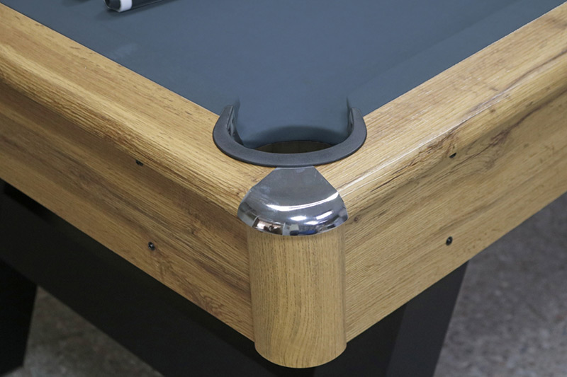 The Walker & Simpson Earl 6ft Pool Table comes in a classic Oak wood grain finish cabinet, black legs and a choice of cloth colours and makes for a very elegant stylish looking table that is at home in the most contemporary of rooms. This high-quality table is constructed from MDF with Oak good grain PVC laminate finish. The table has an overall professional look which is finished by the chrome colour corners.